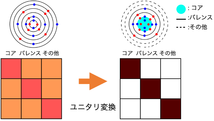 - ユニタリ変換:いくつかの数学的な性質を満たす変換で,例えば、ぐちゃぐちゃのルービックキューブの色を揃えるような操作などがある。また,ハミルトニアン行列の対角化も一つのユニタリ変換と見なすことができる。