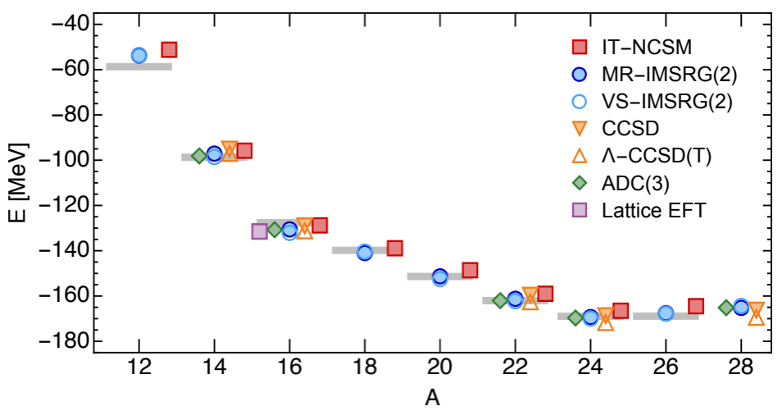 図2. 酸素同位体の基底状態エネルギー。横軸が質量数(A=Z+N)、縦軸が基底状態エネルギー。バーが実験値、それぞれのシンボルは、量子多体問題の各計算手法による結果を表す。バーと全てのシンボルが大体一致していることから、宮城先生が用いるVS-IMSRGを含め、どの計算方法でも問題をそれなりに正確に解けていることが分かる。H. Hergert, Front. Phys. 8, (2020)より引用。