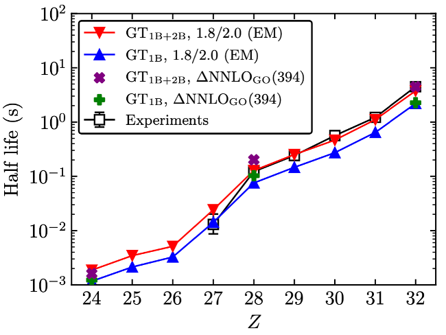 図3. 中性子数を固定した際(N = 50)の、陽子数Z(横軸)ごとのベータ崩壊の半減期の計算結果。Experiments が実験値、それ以外のシンボルが相似くりこみ群法で計算した際の理論値。Z. Li, T. Miyagi, and A. Schwenk, arXiv:2509.06812 (accepted in Phys. Rev. Lett.)より引用。